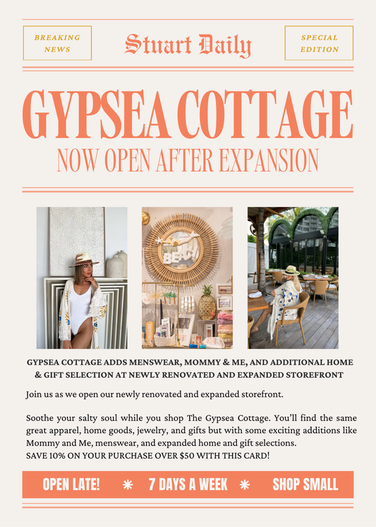 Gypsea Cottage is a wonderland for the salty soul. Coastal living apparel, furnishings, gifts and more. Created by founder Kristen Couperus in 2017 The GypSea Cottage began as a small online store. In 2020, Kristen opened her first brick and mortar in downtown Stuart, Florida.