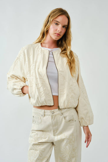 A soft neutral palette meets intricate floral embroidery in these bomber jacket. Designed with a relaxed fit and features elasticated hem at the waist and cuffs. The tonal stitching adds a subtle texture while keeping the look effortlessly wearable. -Bomber Jacket -Tonal floral embroidery throughout -Zip up.