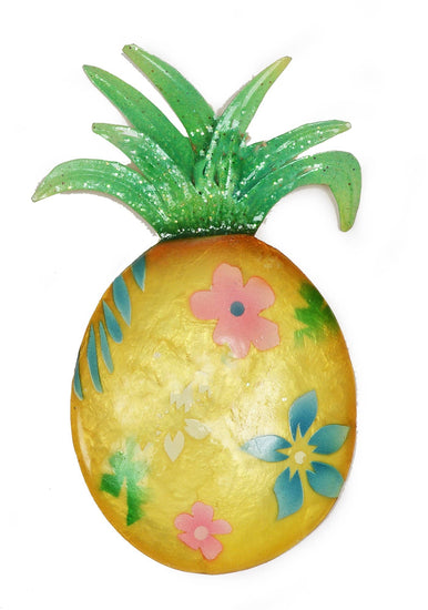 Capiz shell and metal Pineapple ornaments painted in a floral design, Ornaments hang from a twine rope and ship assorted. One orange and one yellow - minimum two.