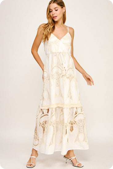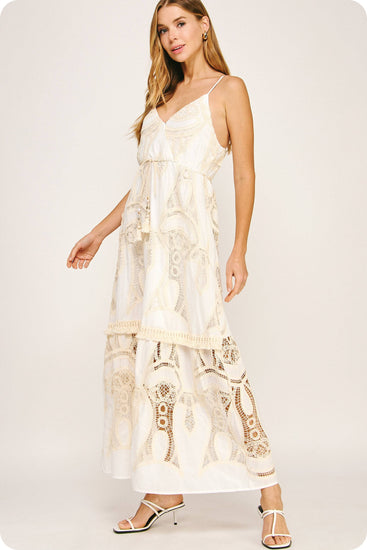 Crochet Lace Maxi Dress in Viscose woven fabric. This crochet lace long dress features a beautiful lace crochet fabric, fringe trim at maxi tiered skirt, adjustable straps, a surplice V neckline, cinched elasticated waist, tie belt detail with tassel, and lining.