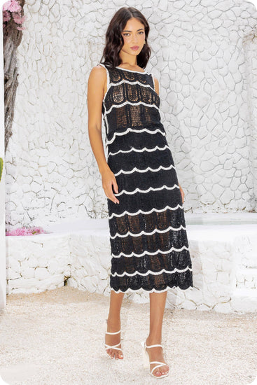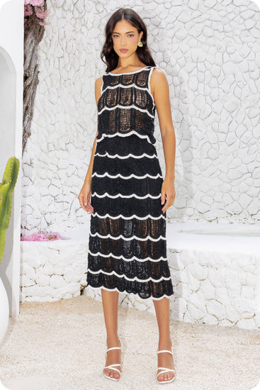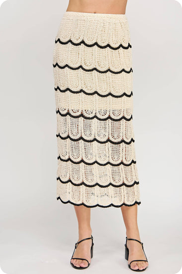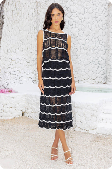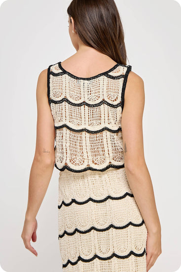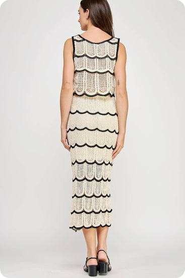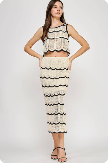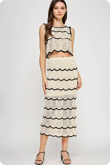 Crop top and midi skirt set in crochet knitted fabric. This set features a sleeveless cropped top with contrast scallop detail and round neck. The midi skirt features half lining, elasticated waist, and contrast scallop detail.
