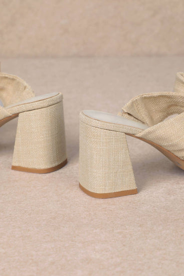 BOW KNOTTED DOUBLE STRAP OPEN SEMI SQUARE TOE BURLAP WRAPPED SEMI FLARE BLOCK HEEL HEEL HEIGHTS: