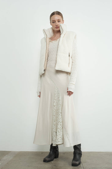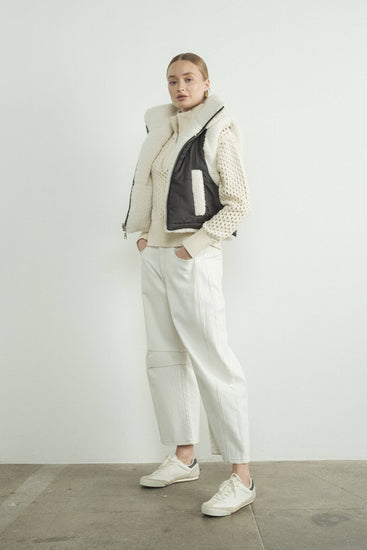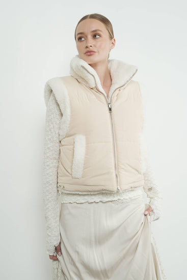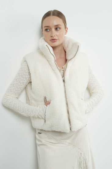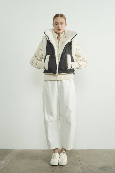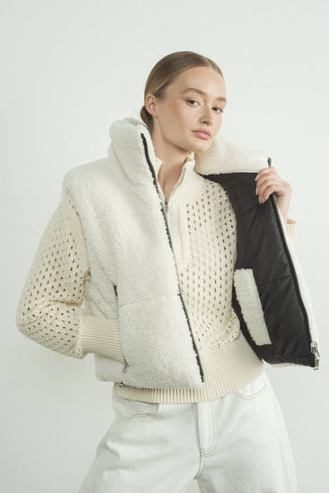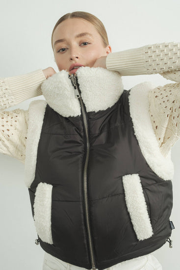 Embrace the ultimate in cozy chic with our Reversible Sherpa Vest. Designed for versatility and comfort. quilted fabric on the other, allowing you to switch up your look with ease. Fur contrast on Collar, Bottom, and Pockets.