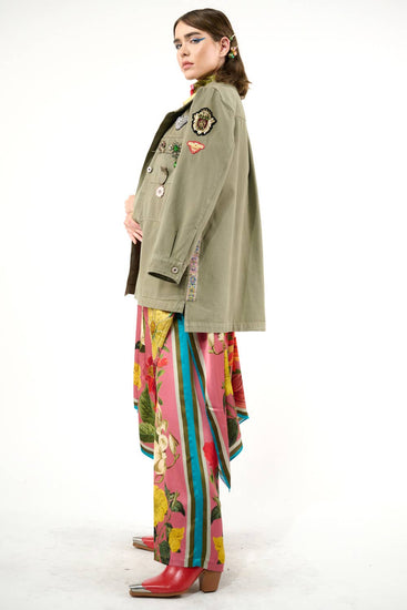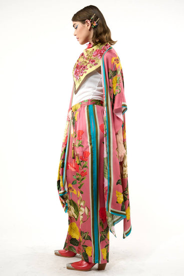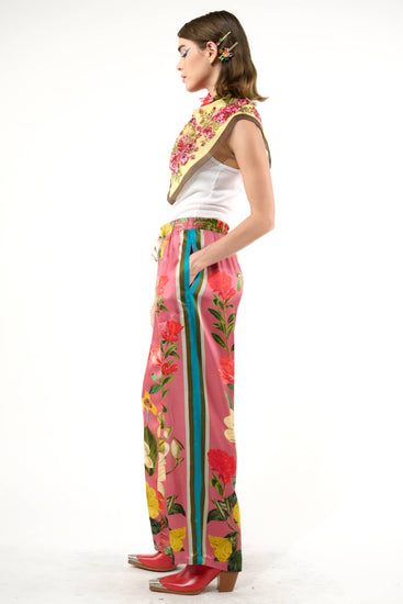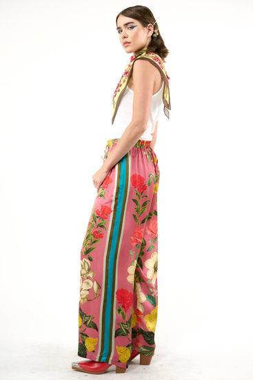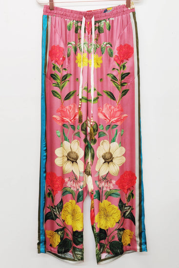 Floral print elastic waist pants with stripes on sides, beaded tassel drawstring, 2 side pockets * Dusty rose floral * Hand wash warm with like colors * Line dry * 100% modal
