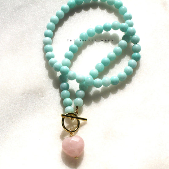 Elevate your energy and style with this serene jade beaded necklace featuring a delicate rose quartz heart pendant. Hand-strung with calming aqua-toned beads and finished with a chic gold toggle clasp, this necklace embodies peace, love, and self-care. Rose quartz is the crystal of unconditional love, making this the perfect piece for everyday healing or gifting.