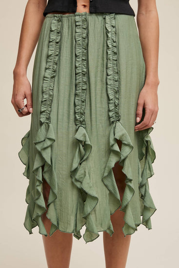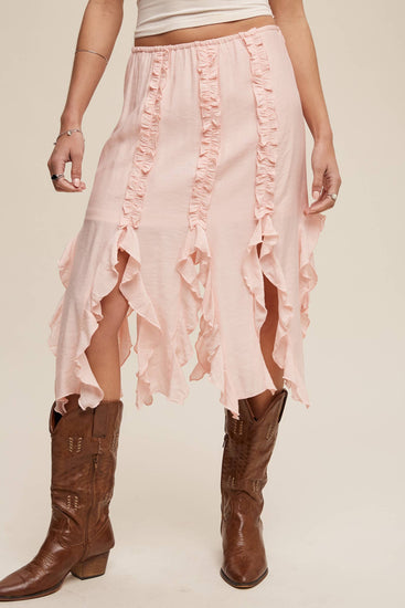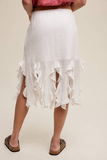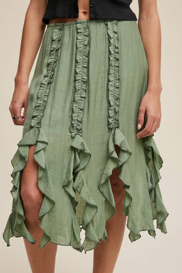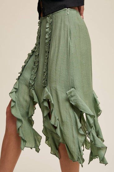 - Asymmetrical hemline featuring a high-low design with cascading ruffles to enhance movement