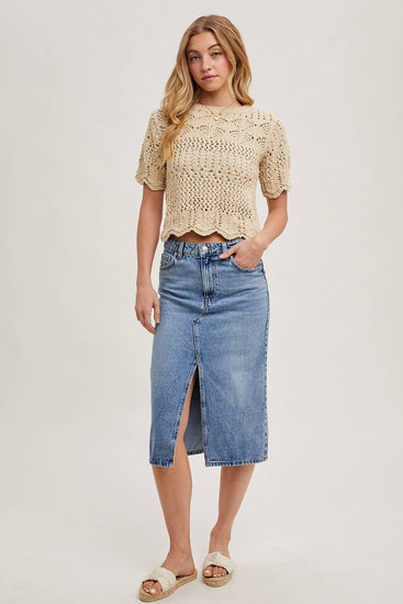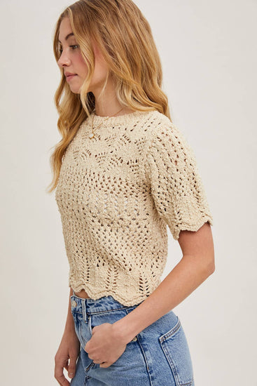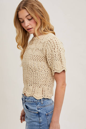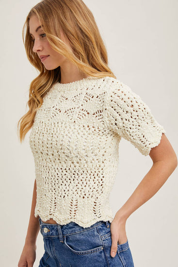 This short-sleeve sheer knit sweater features a delicate scalloped hem, adding a touch of elegance to its airy design. Perfect for layering or wearing on its own, it combines lightweight comfort with a chic, feminine silhouette. Ideal for casual or dressy looks, it pairs beautifully with skirts, trousers, or jeans.