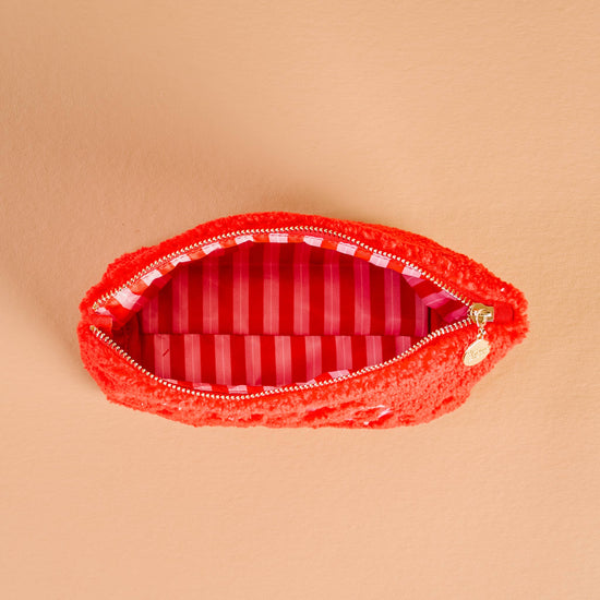Keep your essentials safe, secure, and stylish in our festive Christmas Teddy Pouches. Perfect for cosmetics, travel, purse organization, and more. Stay stylish and efficient with this must-have accessory this season! Pair your rectangle teddy pouches with our coordinating circle and square teddy pouches, perfect for merchandising products together! Cozy sherpa fabric Wipeable lining Gold zipper and hardware Interior printed lining