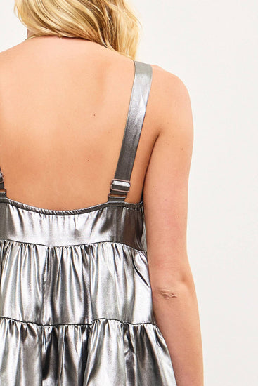 TIERED SHIRRING SLEEVELESS FOIL DRESS