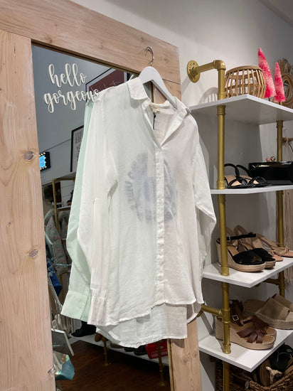 Embrace good energy in this breezy button-down top featuring a whimsical evil eye illustration paired with delicate paisley details. The flowing white fabric moves with you, perfect for beach days, casual outings, or whenever you need to channel those positive vibes. With its relaxed fit and playful spirit, this piece is your new go-to for effortless coastal style. No bad vibes allowed—just pure, carefree comfort.