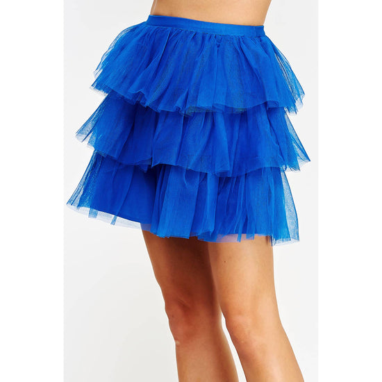 Tiered mini skirt in tulle fabric. This ruffle frill mini skirt features tiered layers of color block tulle, lining, and elastic waistband.