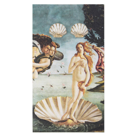 Shell post earrings inspired by a masterpiece. Gold shell post earrings with white enamel are beautifully displayed on Botticelli's Birth of Venus fine art print card. The elegant shell design captures timeless charm, making these earrings a wearable ode to classic art and seaside beauty. • Made in China • Gold shell post earrings with white enamel • Art carded earring with painting and artist information on back • Materials: Gold Tone Metal, Enamel • Measurements: 3/8"