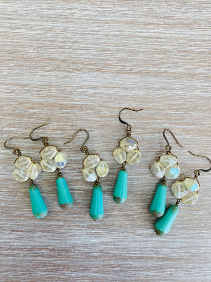Faceted Czech crystal in shimmering opal tones with a delicious deep aqua faceted glass drop on hypoallergenic French hooks with backing piece. Perfect for summer cocktail parties and weddings!
