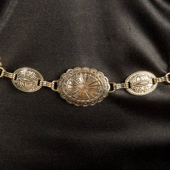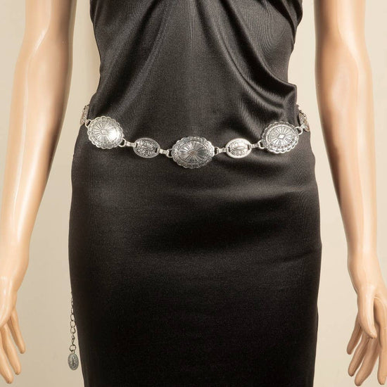 A bold and daring choice that is sure to impress, this chain belt possesses a fine western abstract pattern concho design. Perfect for dressing up your favorite outfit, this chain belt is a must-have. Available in G, S. This item is sold in packs of 1.